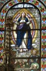 Cele mai spectaculoase sunt vitraliile din prezbiteriu. După modelul celor vechi, pictura centrală o reprezintă pe Sfânta Fecioară, aici surmontată de Porumbelul Sf. Duh și încoronată de doi îngeri. Contrastul puternic dintre rochia de aur și mantia tradițională, albastru cobalt, strălucitoare, evidențiază silueta elegantă a Mariei și gestul de magnificat al capului și al mâinilor delicate.