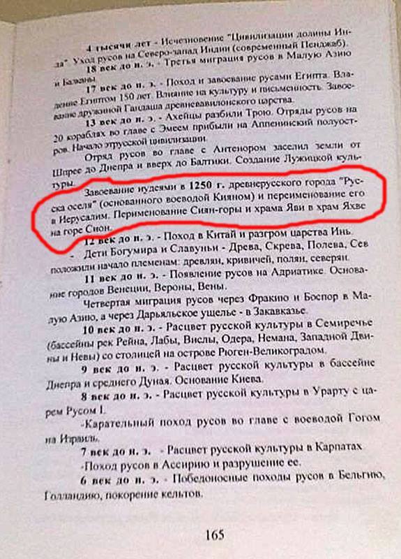 Pasajul din manual marcat cu roșu vorbește despre „cucerirea de către evrei a orașului antic „Oselia Rusă” (fondat de voievodul Kiyan) în 1250 și despre redenumirea lui în Ierusalim. Muntele Siyan și templul Yavi au fost redenumite drept templul Yahweh și Muntele Sion”, conform manualului.