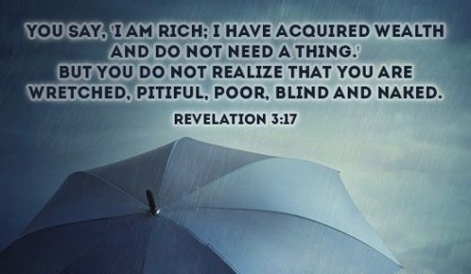 Pentru că zici: “Sunt bogat, m-am îmbogăţit, şi nu duc lipsă de nimic“, şi nu ştii că eşti ticălos, nenorocit, sărac, orb şi gol… (Apocalipsa 3:17)