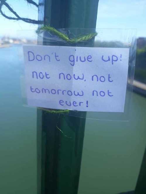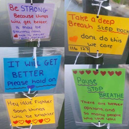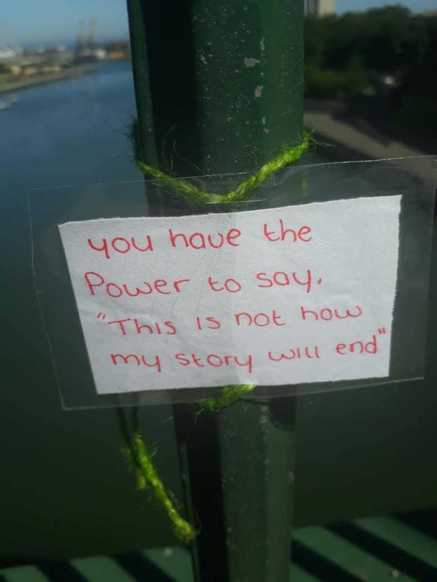 “Vreau să spun un mare THANKYOU! pentru tânăra care a scris notele, pentru că nu numai că a salvat o singură viață, ci că a salvat două, dar, probabil, multe altele. La ora 18:00 am coborât la pod cu singura intenție de a-mi sfârși viața, dar când am ajuns acolo, am văzut cel puțin 40 de note colorate strălucitor de fiecare parte. Când eram pe punctul de a escalada podul, m-am oprit la o notă care spunea “FII STRONG pentru că lucrurile se vor îmbunătăți; acum, poate e furtună mare pentru tine, dar nu plouă pentru totdeauna!” și mult mai mult. Dacă nu era acea notă strălucitoare, aș fi fost în fundul râului și familia mea ar fi fost distrusă. Deci THANKYOU !!! Ești o frumoasă tânără doamnă cu inima de aur și meriși recunoștință pentru ceea ce ai făcut “.