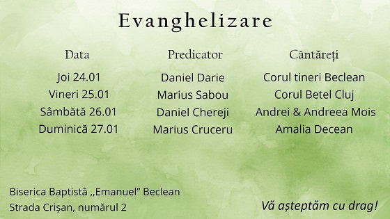 Biserica Baptistă din Beclean – Seri de Evanghelizare On January 23, 2019January 23, 2019 By GeorgeIn Eveniment Cu predicatori cu nume Daniel Darie, Marius Sabou, Daniel Chereji, Marius Cruceru. Beclean, strada Crișan nr.2. Share this:Share Email a link to a friend (Opens in new window) Email Print (Opens in new window) Print Share on X (Opens in new window) X Share on Facebook (Opens in new window) Facebook Share on LinkedIn (Opens in new window) LinkedIn Share on Reddit (Opens in new window) Reddit Like Loading... Related
