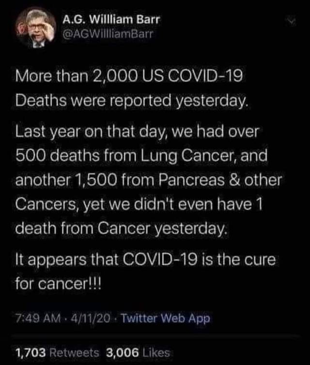 Peste 2000 de morți de covid19 au fost raportate ieri. Anul trecut în aceeași zi au fost raportate 500 de decese de cancer de plămâni, 1500 de decese de cancer de pancreas și alte tipuri de cancer. Anul acesta în aceeași zi, nu avem niciun raport de vreun deces de cancer. Se pare că Covid19 este cura pentru cancer?!