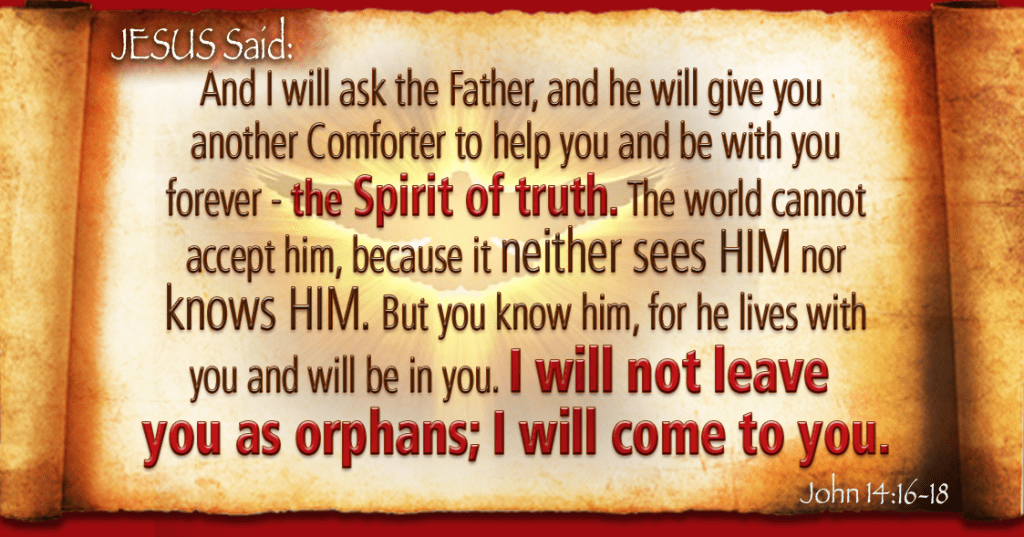Și Eu voi ruga pe Tatăl, și El vă va da un alt Mângâietor, care să rămână cu voi în veac; și anume Duhul adevărului, pe care lumea nu-L poate primi, pentru că nu-L vede și nu-L cunoaște; dar voi Îl cunoașteți, căci rămâne cu voi și va fi în voi. Nu vă voi lăsa orfani, Mă voi întoarce la voi. [Ioan 14:16- 18]