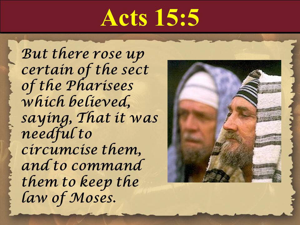 Atunci unii din partida fariseilor, care crezuseră, s-au ridicat și au zis că Neamurile trebuie să fie tăiate împrejur și să li se ceară să păzească Legea lui Moise. [Faptele Apostolilor 15:5]