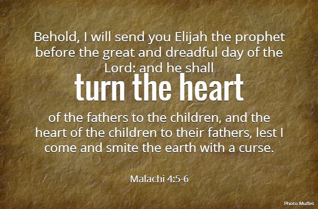 “Iată, vă voi trimite pe prorocul Ilie înainte de a veni ziua Domnului, ziua aceea mare şi înfricoşată. El va întoarce inima părinţilor spre copii şi inima copiilor spre părinţii lor, ca nu cumva, la venirea Mea, să lovesc ţara cu blestem!” (Maleahi.4:5-6)