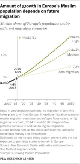 Un studiu afirma în anii trecuți că până în 2075 islamul va deveni religia cea mai numeroasă a planetei, iar creștinismul va fi pe locul doi. Predicțiile astea sunt deosebit de provocatoare pentru Europa unde în prezent 5% din populație e musulmană. În cifre, asta înseamnă 25,8 milioane de persoane.