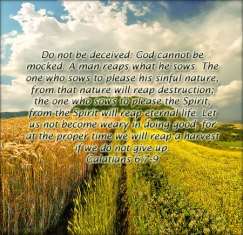 Nu vă înşelaţi: „Dumnezeu nu Se lasă să fie batjocorit”. Ce seamănă omul, aceea va şi secera. Cine seamănă în firea lui pământească va secera din firea pământească putrezirea, dar cine seamănă în Duhul va secera din Duhul viaţa veşnică. Să nu obosim în facerea binelui, căci, la vremea potrivită, vom secera, dacă nu vom cădea de oboseală. Aşadar, cât avem prilej, să facem bine la toţi, şi mai ales fraţilor în credinţă. (Galateni 6:7-10)