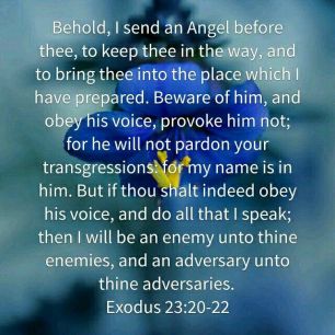 Iată, Eu trimit un Înger înaintea ta, ca să te ocrotească pe drum şi să te ducă în locul pe care l-am pregătit. Fii cu ochii în patru înaintea Lui şi ascultă glasul Lui; să nu te împotriveşti Lui, pentru că nu vă va ierta păcatele, căci Numele Meu este în El.